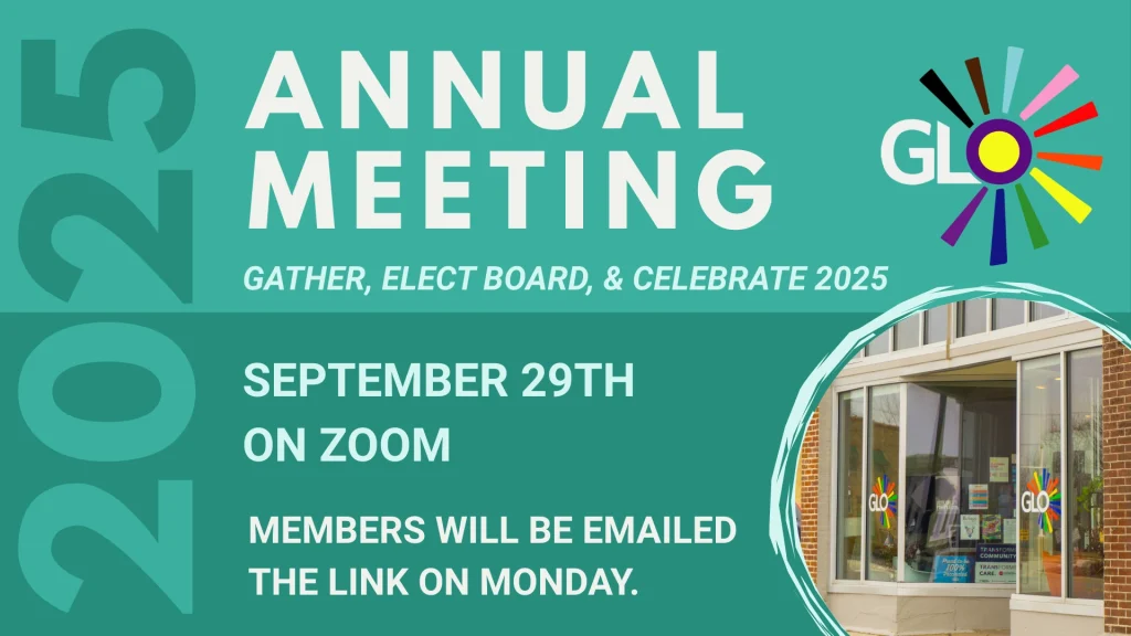 Note: On Monday, September 22, at approximately 10:00 a.m., GLO Center staff received a threat to the Center and our community. For safety, the Center closed and cancelled all events for the day, including the Annual Meeting. After careful consideration, The GLO Center has decided to move the Annual Meeting to Zoom. Members will be emailed the link on Monday 9/29.